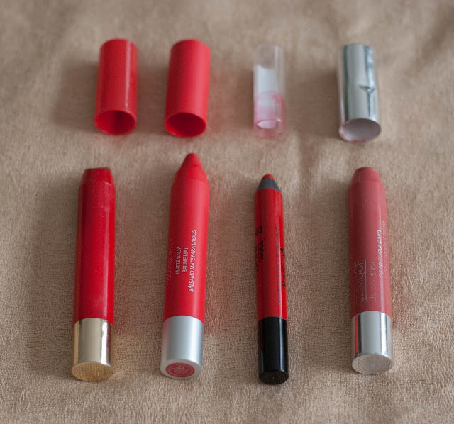 | L to R: Astor „VaVaVoum“, Revlon „Striking“, P2 „Burning Red“, Clinique „Mega Melon“ |
