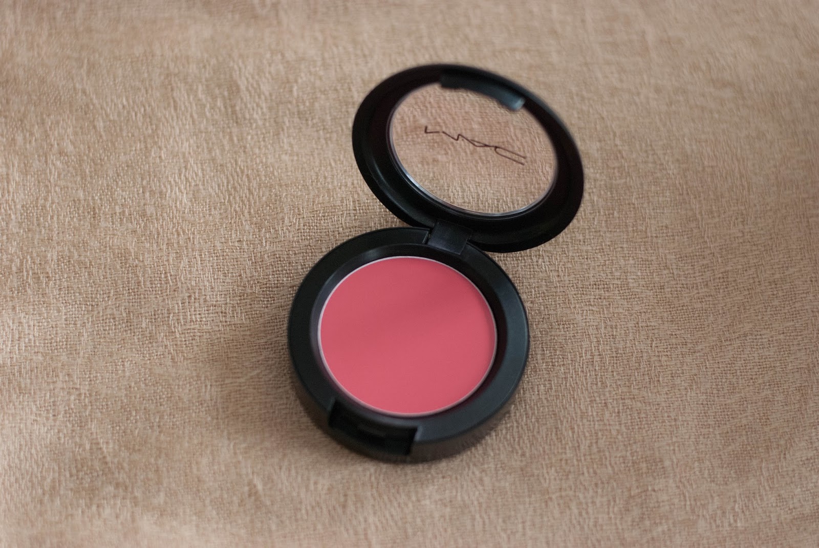 The color is described as „carnation pink“ by MAC and looks like a warm, almost coral pink in the pan. When applied to my skin, it looks like a true, warm pink.