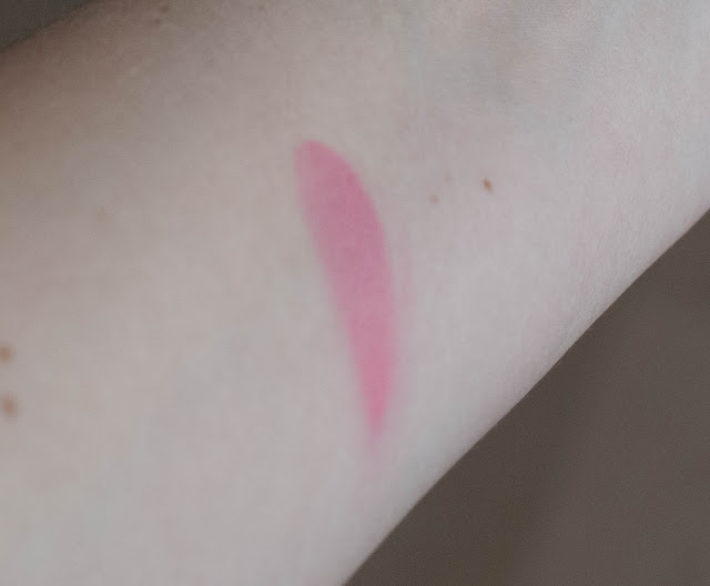 On my lips it creates a soft pink, satiny finish and stays put for three hours (no eating or drinking). It is a little dying, so I need to make sure my lips are moisturized well before applying it.