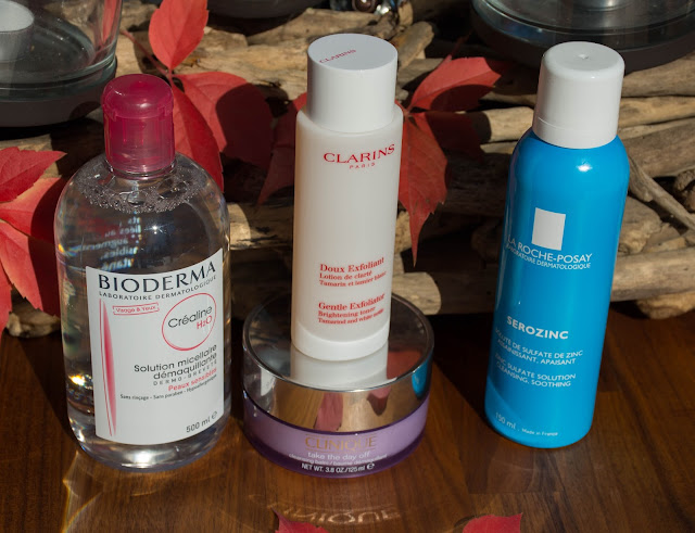 | Bioderma Eau Sensibio, Clarins Doux Exfoliant, Clinique „Take the day off“, La Roche Posay Serozinc |